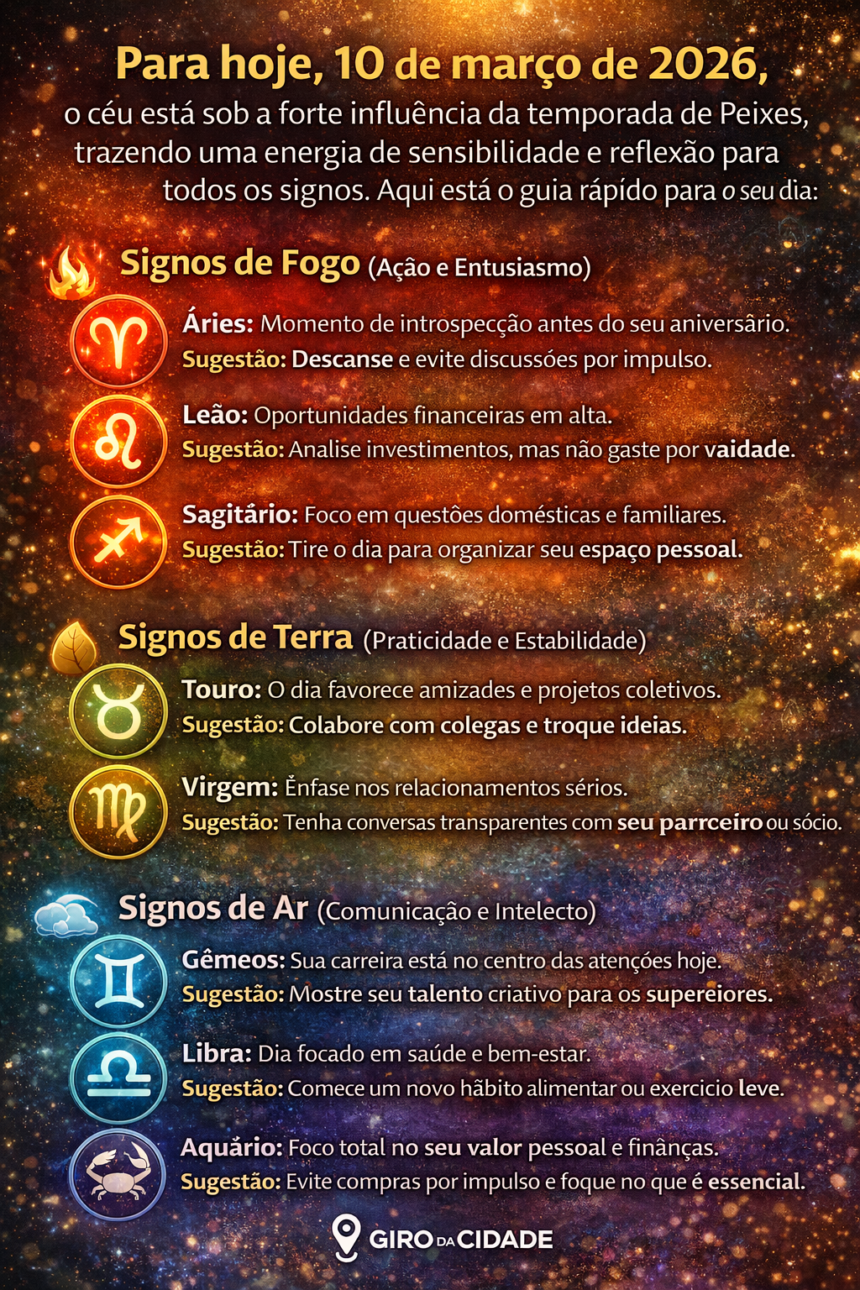 Em resumo, o dia 10 de março de 2026 é uma oportunidade para todos os signos tirarem um momento para refletir, ajustar suas prioridades e se conectarem com suas emoções. A energia de Peixes nos lembra que a sensibilidade e a intuição podem ser nossos maiores aliados.