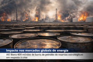 Como consequência direta da guerra, o mercado de petróleo enfrenta uma das maiores crises das últimas décadas. A Agência Internacional de Energia (AIE) anunciou uma medida histórica: a liberação de 400 milhões de barris de petróleo de suas reservas estratégicas. Este movimento, que representa a maior ação desse tipo já realizada, tem como objetivo mitigar a escassez global de combustível e estabilizar os preços.